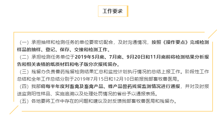 (三)残留办负责兽药残留检测结果汇总和监控计划执行情况的总结上报工作。阶段性工作总结和全年工作总结分别于2019年7月15日和12月10日前报我部畜牧兽医局。