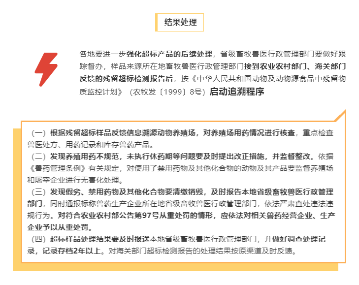 各地要进一步强化超标产品的后续处理,省级畜牧兽医行政管理部门要做好跟踪督办,样品来源所在地畜牧兽医行政管理部门接到农业农村部门、海关部门反馈的残留超标检测报告后,按《中华人民共和国动物及动物源食品中残留物质监控计划》(农牧发〔1999〕8号)启动追溯程序。
