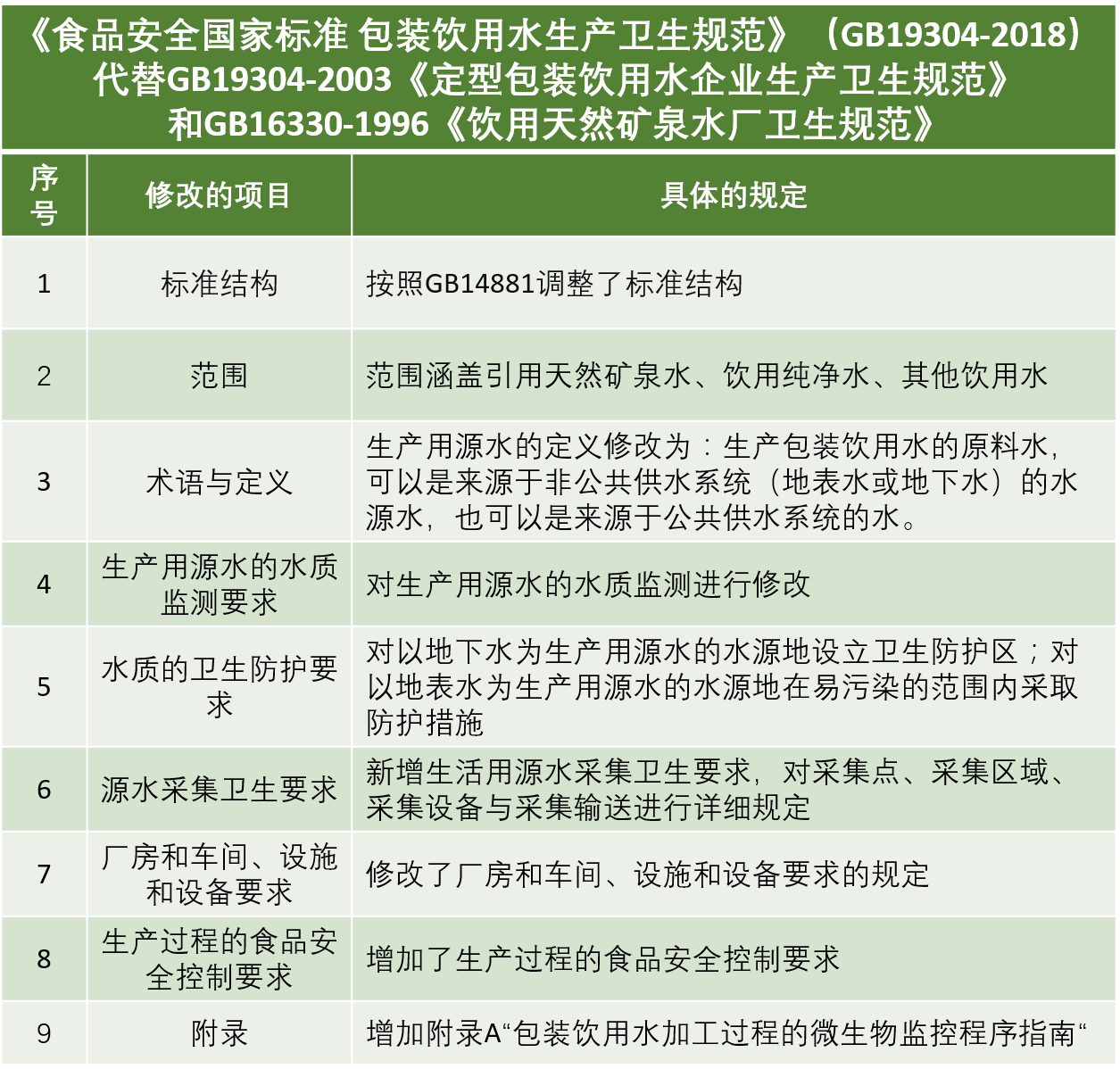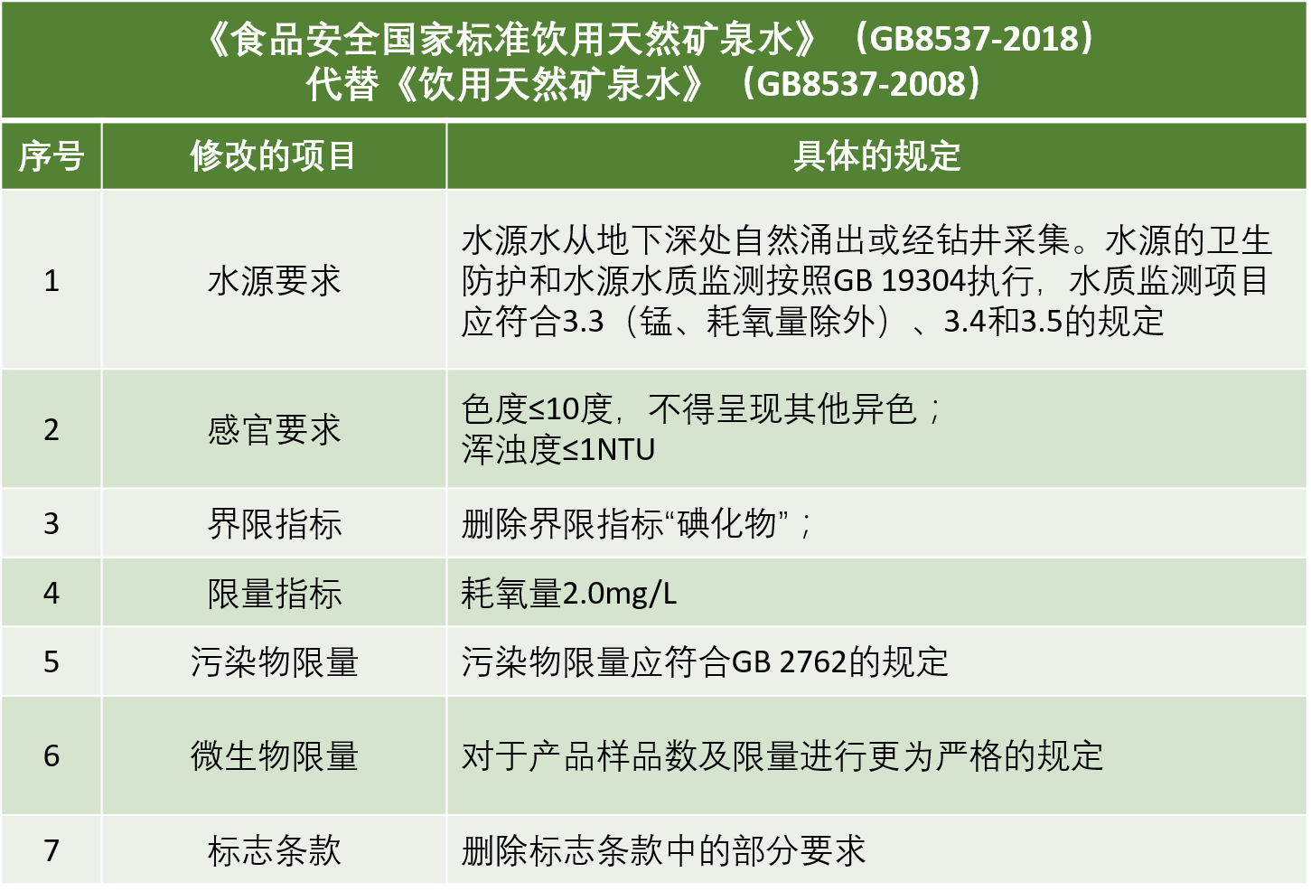 2018年6月21日,国家卫生健康委员会和国家市场监督管理总局联合发布了两项包装饮用水密切相关的食品安全国家标准:《食品安全国家标准饮用天然矿泉水》(GB8537-2018)、《食品安全国家标准包用水生产卫生规范(GB19304-2018)。这两项标准将于2019年6月21日起实施,以下是新标准与原标准相比的主要变化。