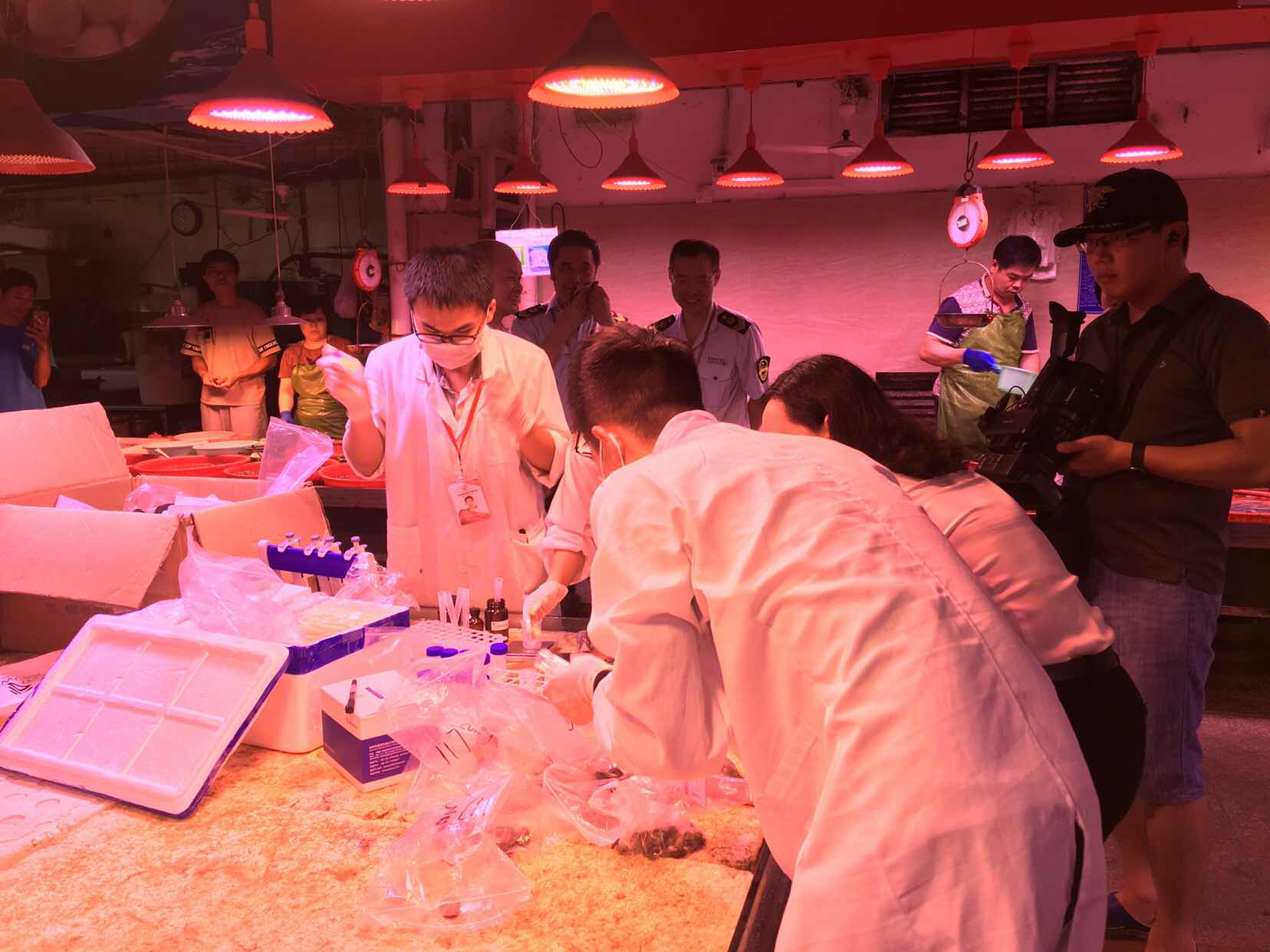 据报道,万田检测快检组工作人员在珠合综合市场随机抽取壳类和淡水鱼等水产品,在现场进行氯霉素含量的快速检测;在龙北农贸市场随机购买壳类和鱼类水产品并在市场的快检室进行氯霉素和孔雀石绿的快速检测工作。