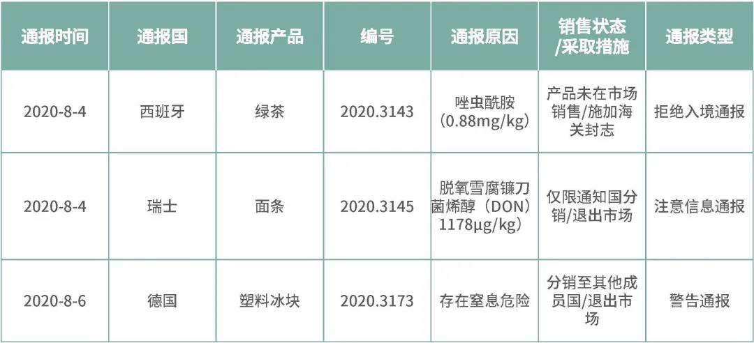 据欧盟食品饲料类快速预警系统(RASFF)消息,近期欧盟通报我国出口绿茶、面条和塑料冰块不合格。具体通报信息如下表。