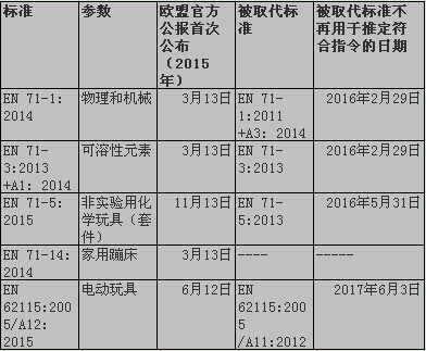 2015年11月13日,OJEU发表了欧委会通报2015/C 378/01协调 EN 71-5:2015,以推定符合玩具安全指令。根据上述通讯报道,EN 71-5:2013将于2016年5月31日不再用来证明符合玩具安全指令。