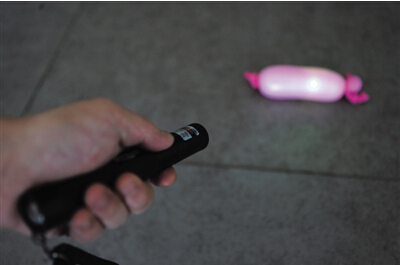 记者以99元购买了一支最大功率为200毫瓦的激光笔,将激光笔在一米远的距离对准一个吹得半满的气球,这时气球壁比较厚,打开激光笔,光线在气球上照射5分钟,气球没有被打爆,外壁上也没有留下黑印等。随后,将气球吹到最大,气球壁比较薄,将激光笔放在距离气球一米远的地方,对准气球,打开激光笔,气球瞬间被打爆。