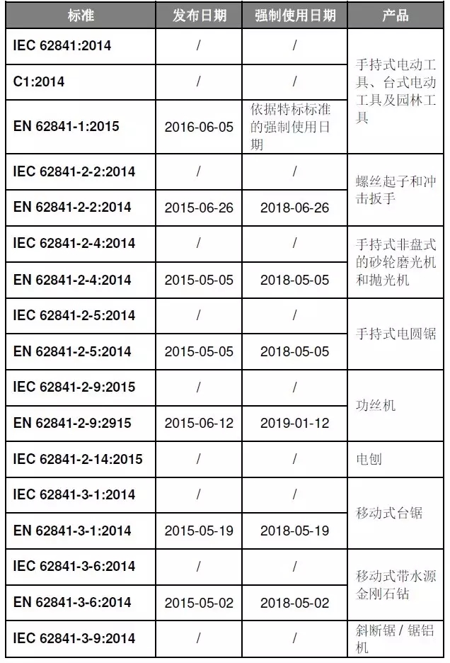 目前颁布的部分IEC 62841新标准列表及生效日期如下: